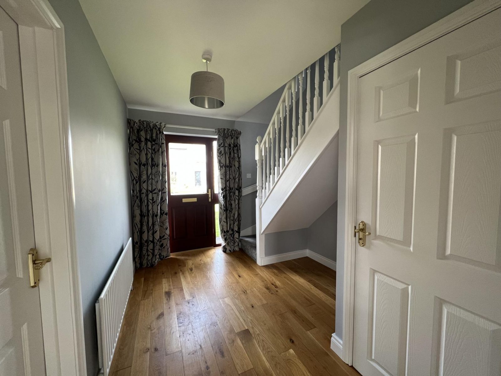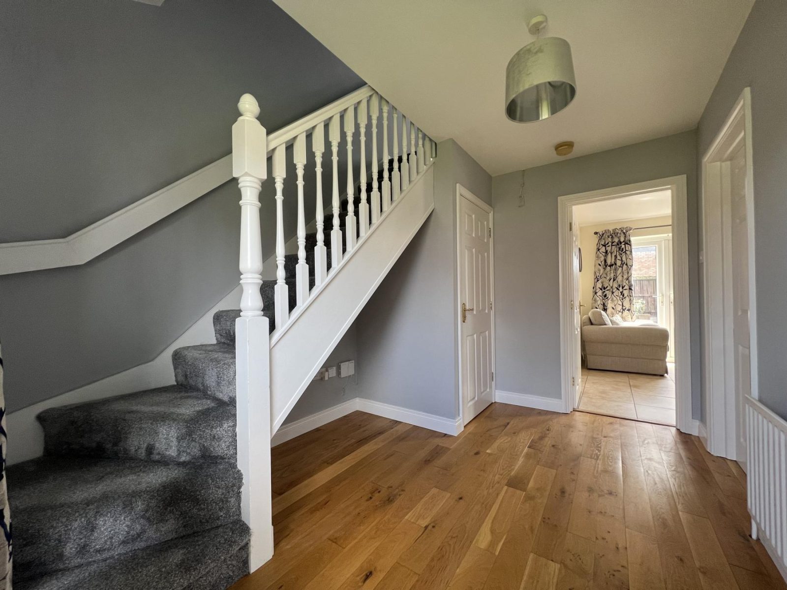 Hall: Bright entrance with wooden floor, new grey carpet stairwell/landing. Measurements: 3.59m x 1.56m