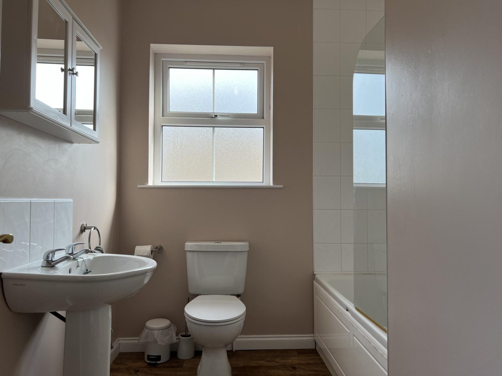 Bathroom: White bathroom suite with bath / shower. Measurements: 2.7m x 2.10m