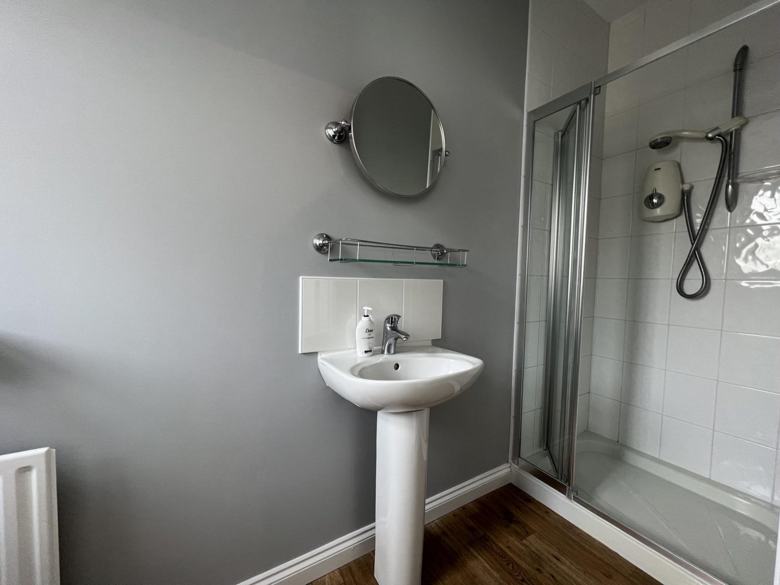 Ensuite: A modern white bathroom with electric shower. Measurements: 3.26m x 0.97m