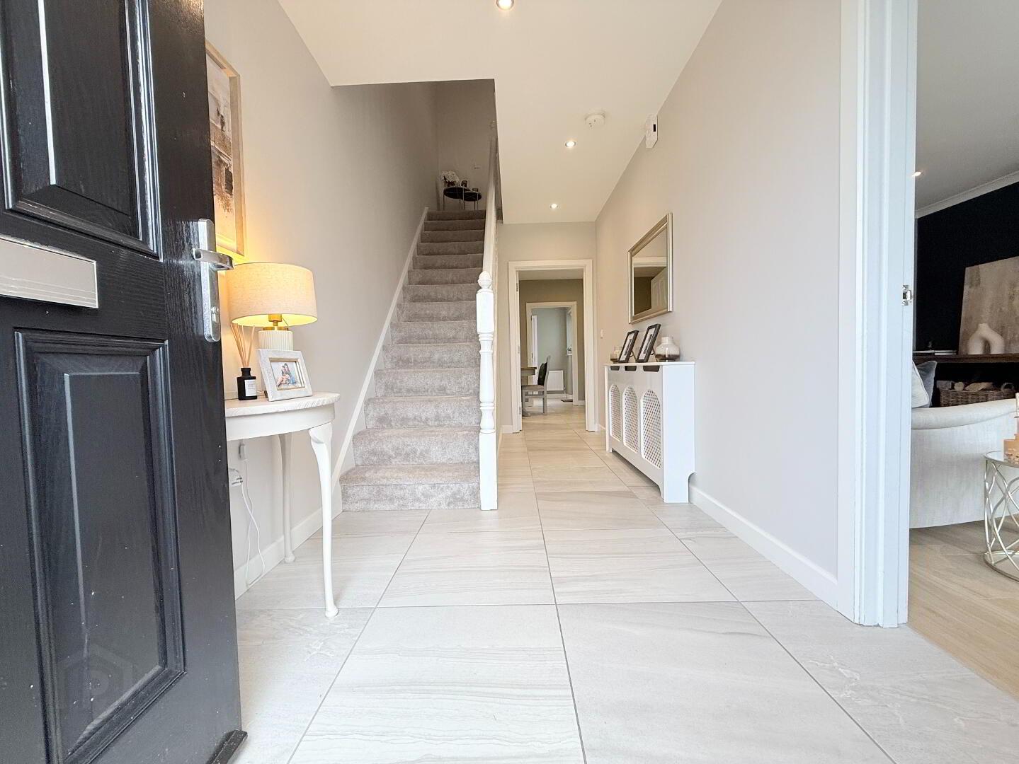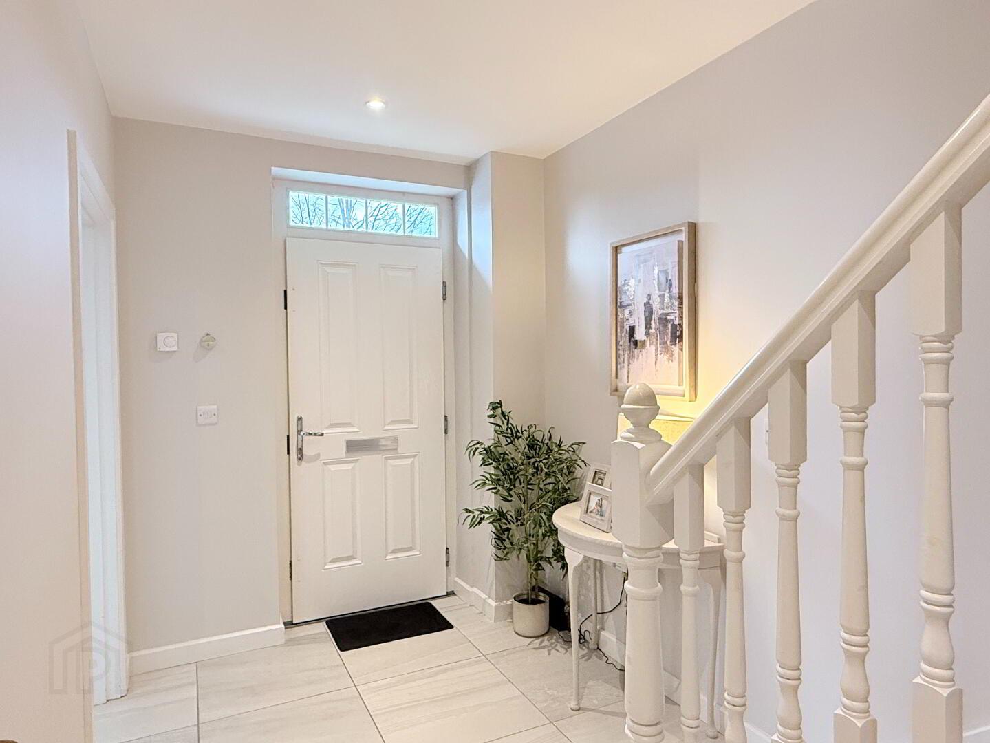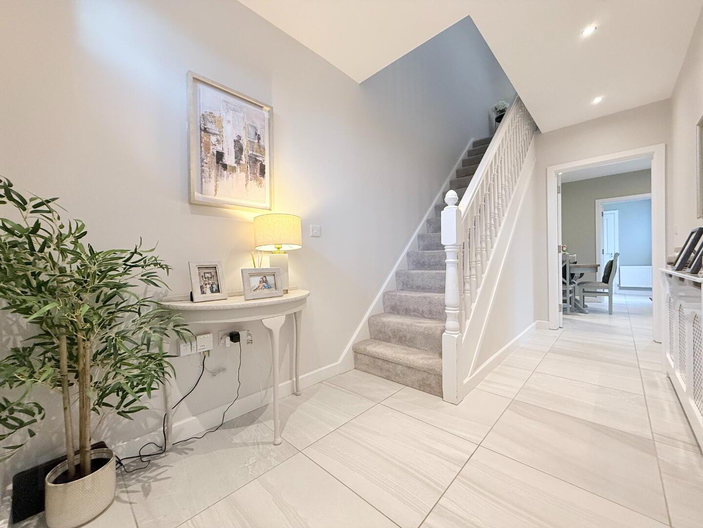 Bright and spacious entrance hall with composite front door, modern tiled flooring, and a white painted staircase leading to luxurious carpet stairwell.