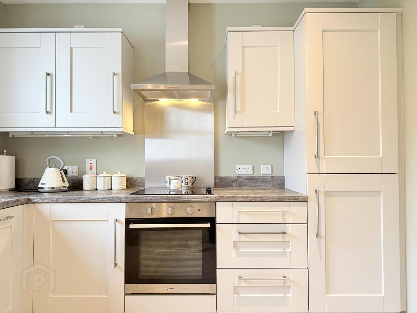 Spacious open-plan area with modern tiled flooring throughout. The beautiful L-shaped kitchen is fitted with high- and low-level units, laminate worktops, and upstands. Integrated appliances include a fridge/freezer, dishwasher, four-ring hob, and oven.