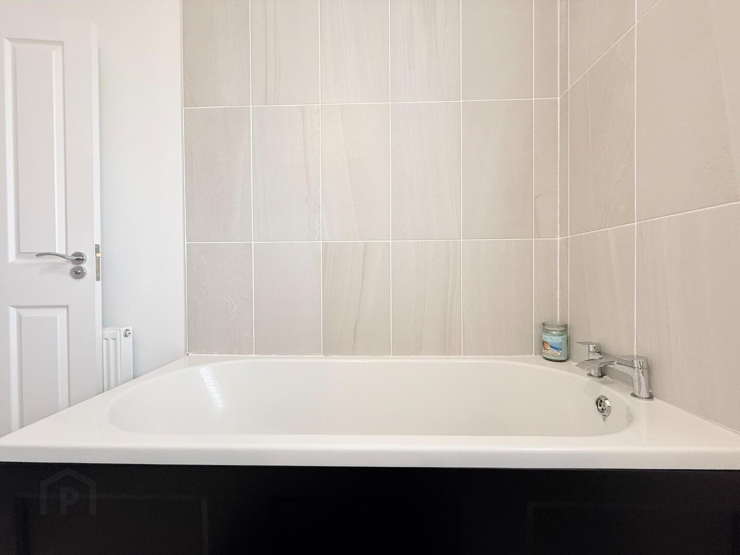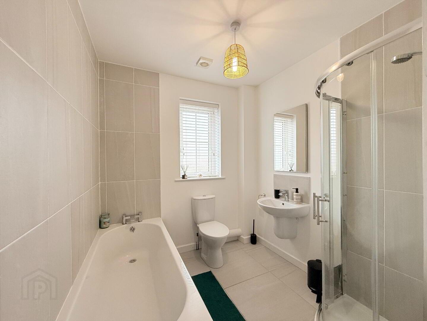Stylish four-piece suite with high-quality sanitary ware, tiled flooring, bath, and power shower.