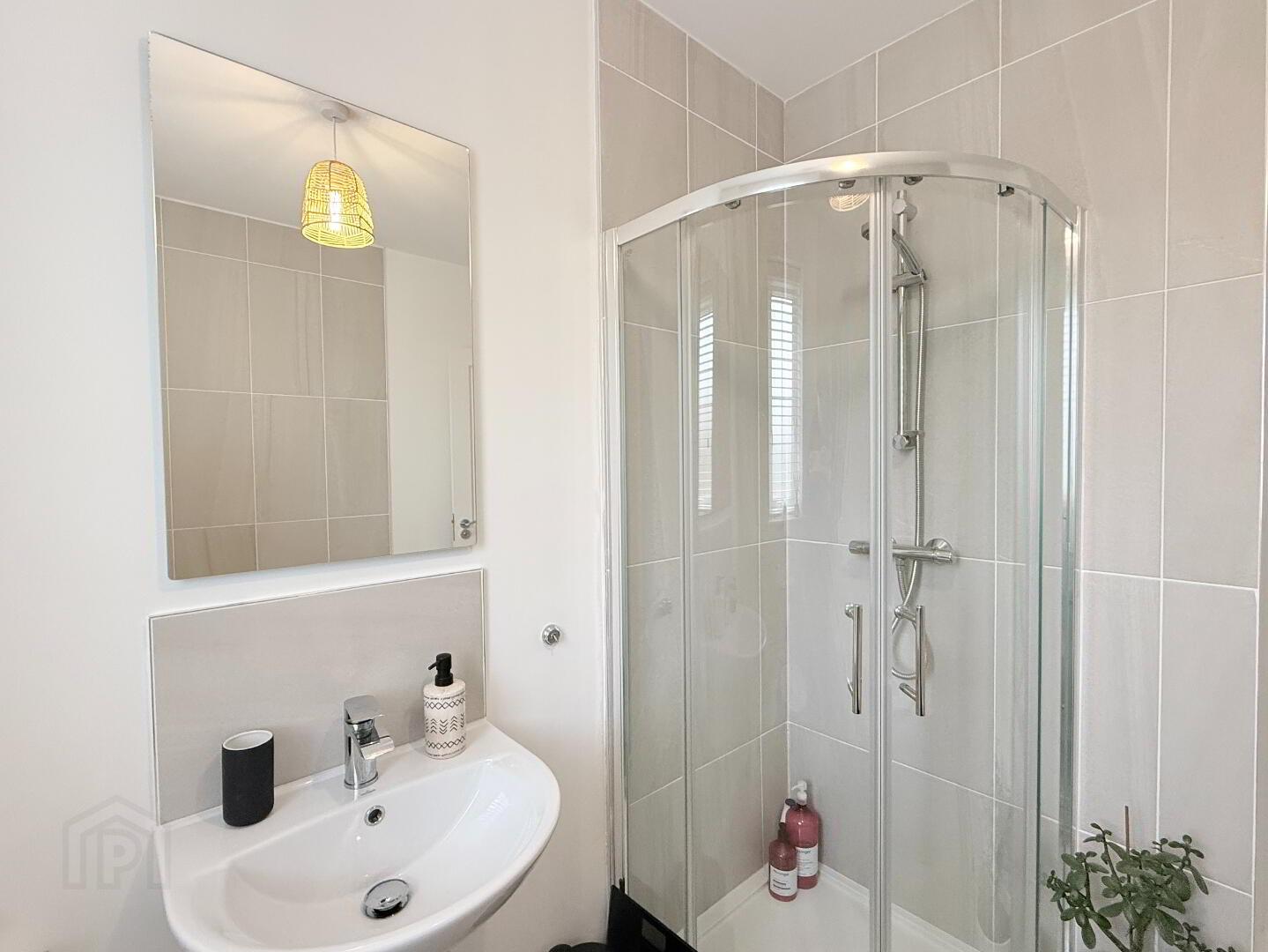 Modern three-piece suite with tiled flooring, power shower, and vanity unit.