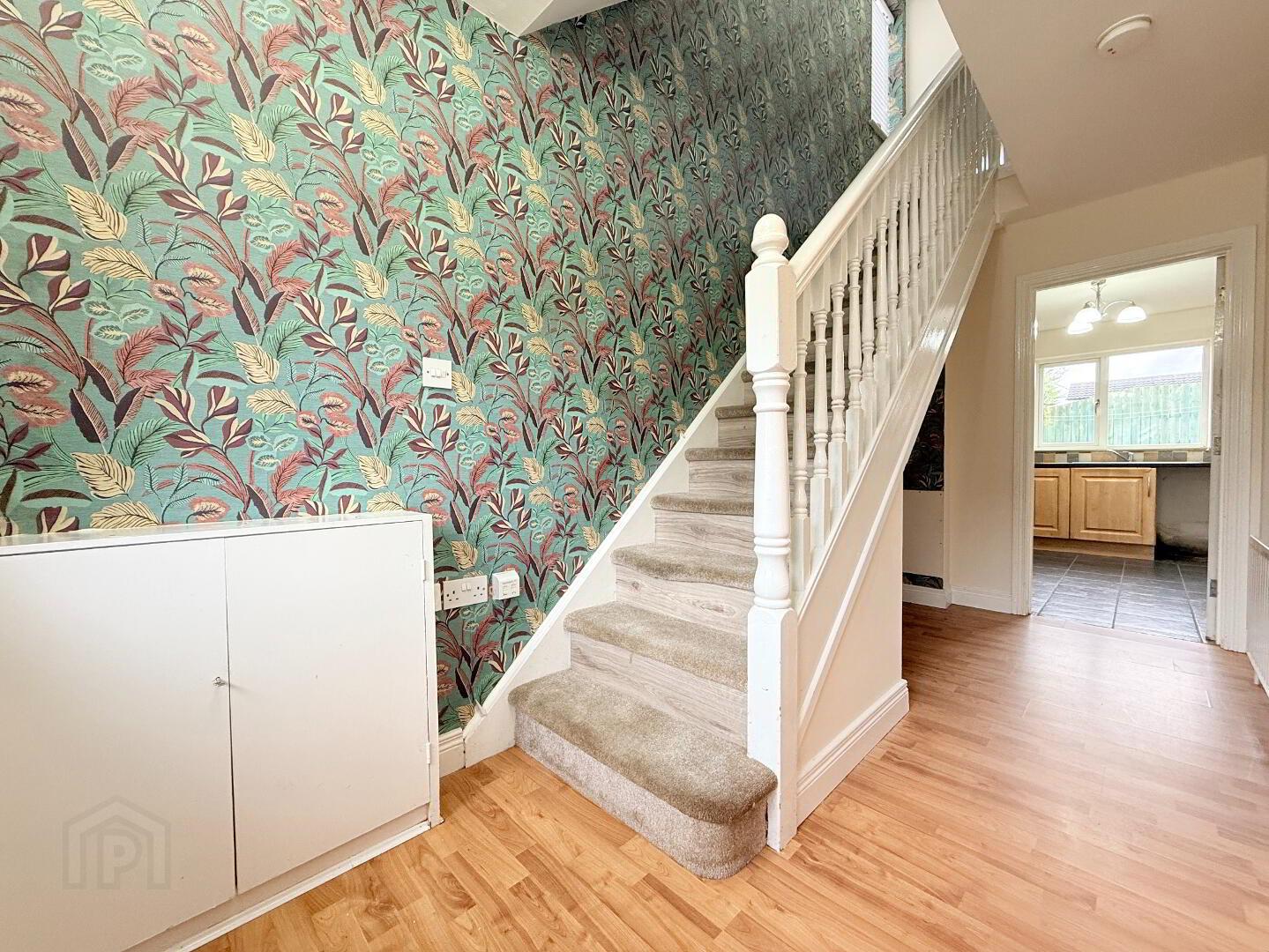 Entrance Hall: Bright spacious entrance hall with wooden front door. Laminate wooden flooring, solid wooden staircase with carpet threads and open under stair storage. Measurements: 4.12m x 1.78m.