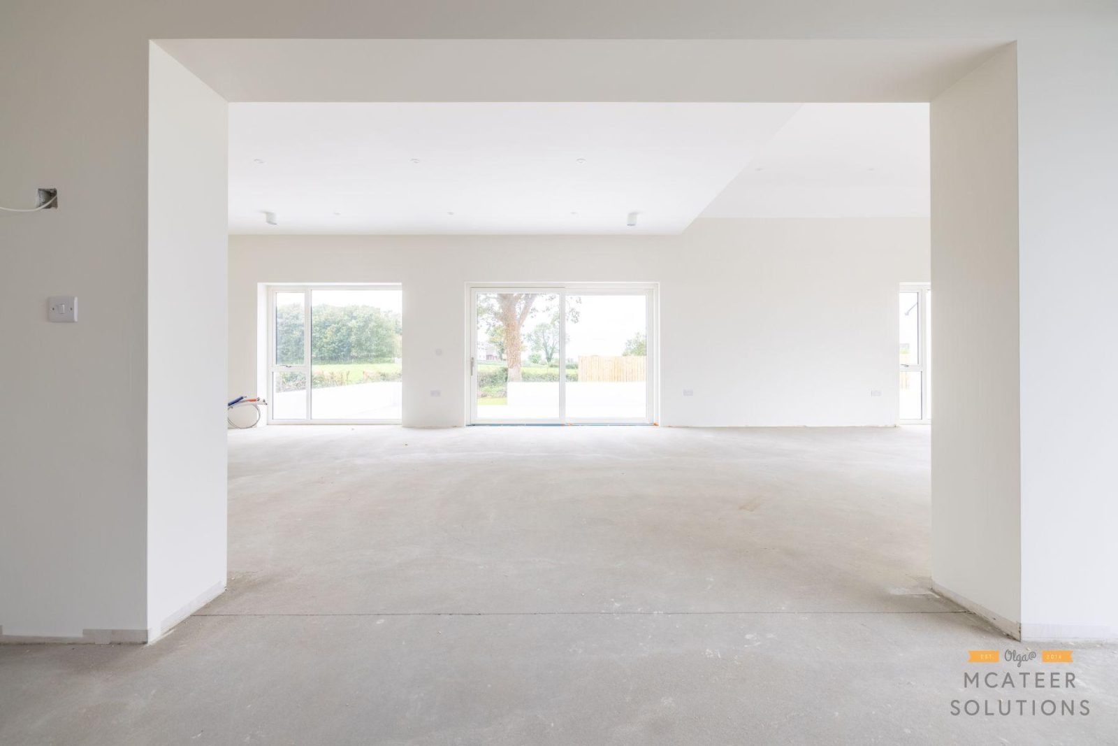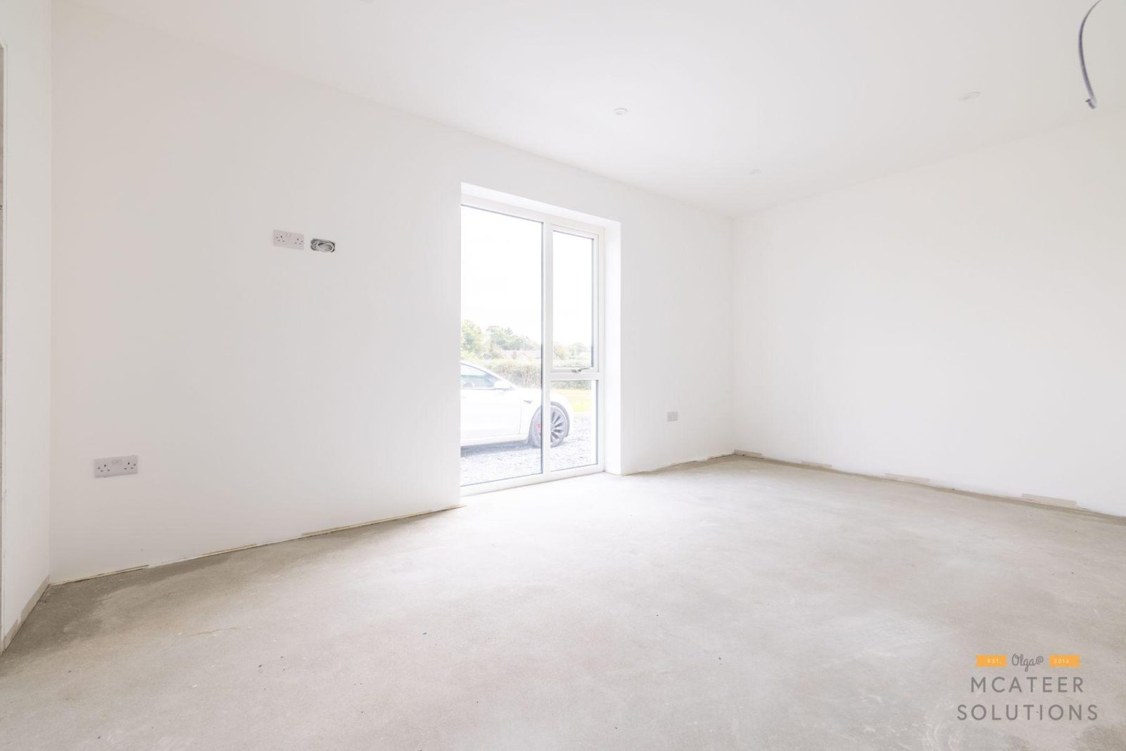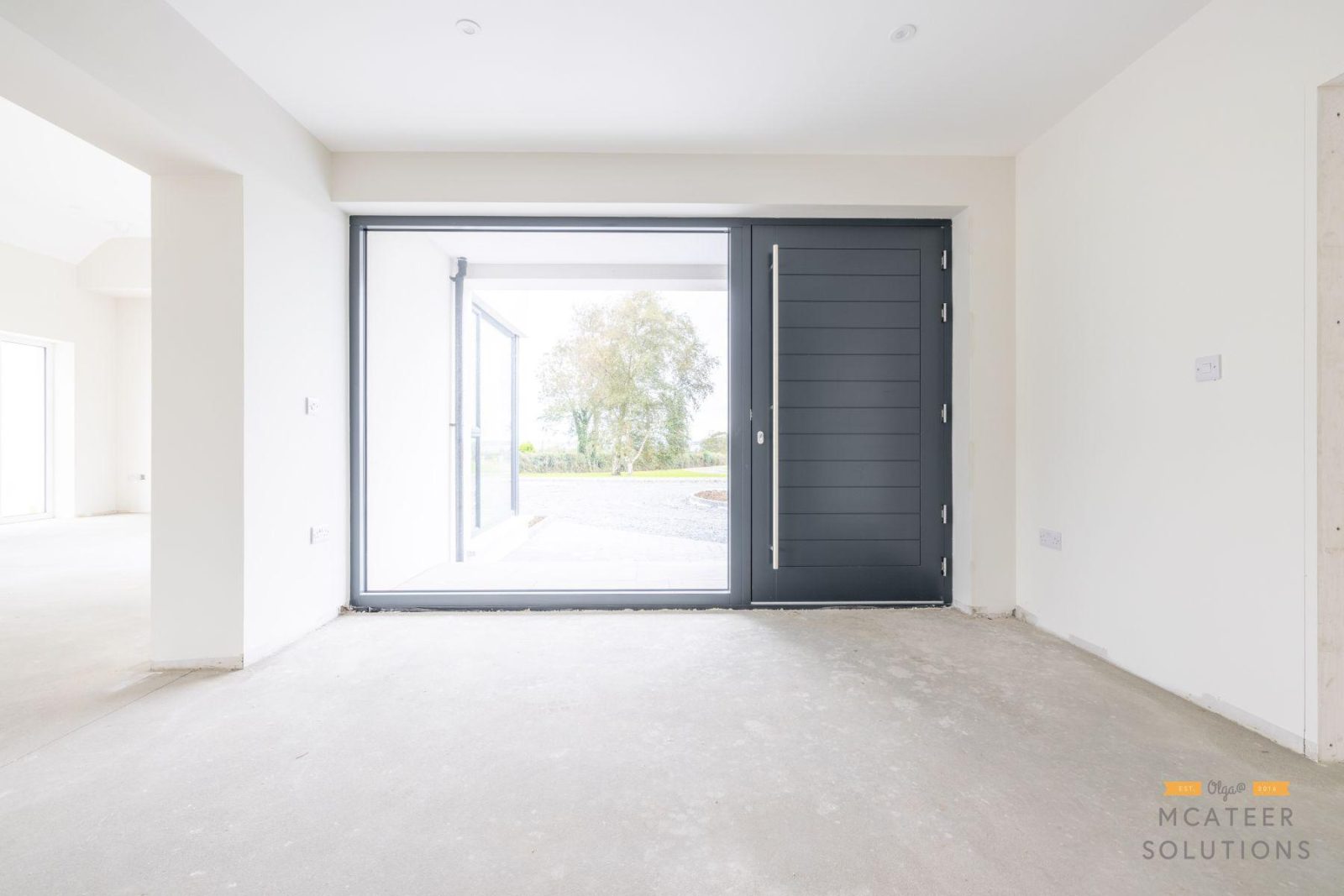 Entrance Hall: Porcelain tile step, composite front door with large floor to ceiling window, buyers’ choice of floor finish. Measurements: 4.83m x 3.66m.