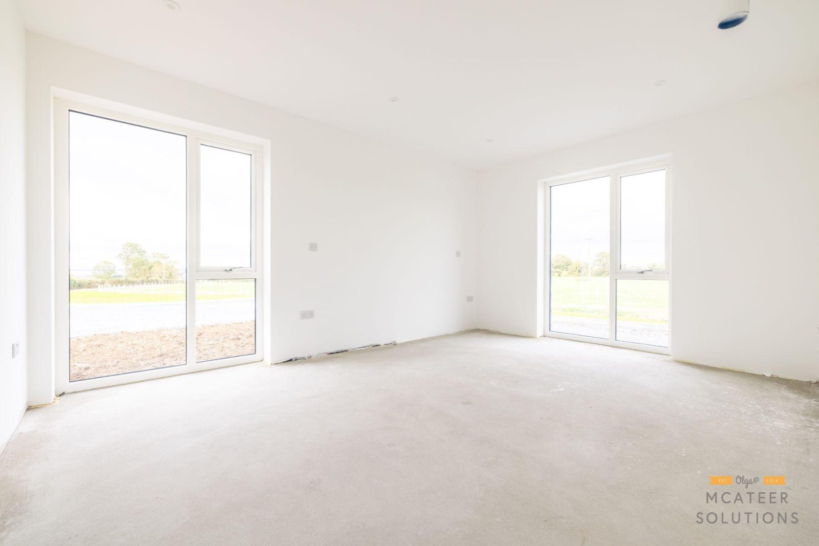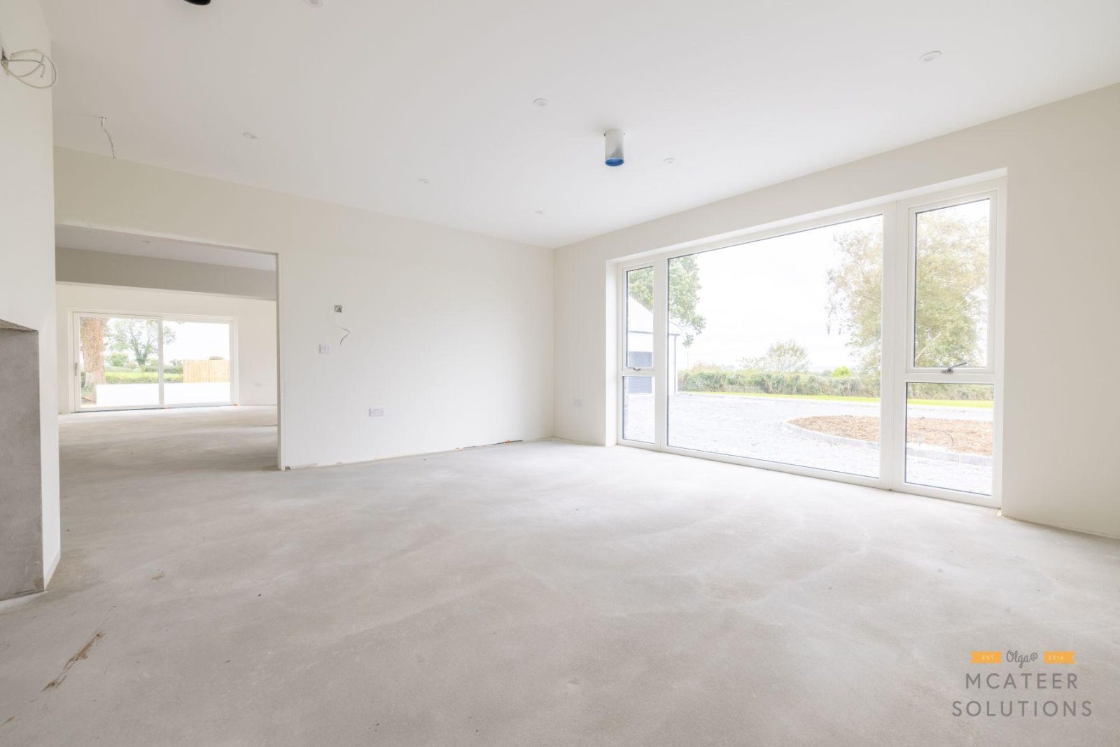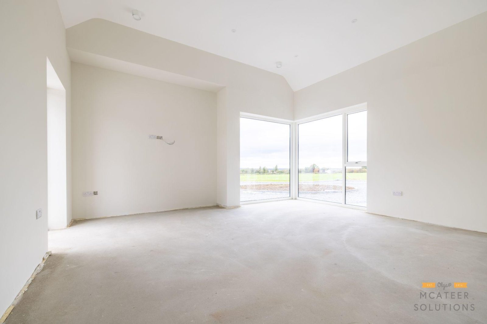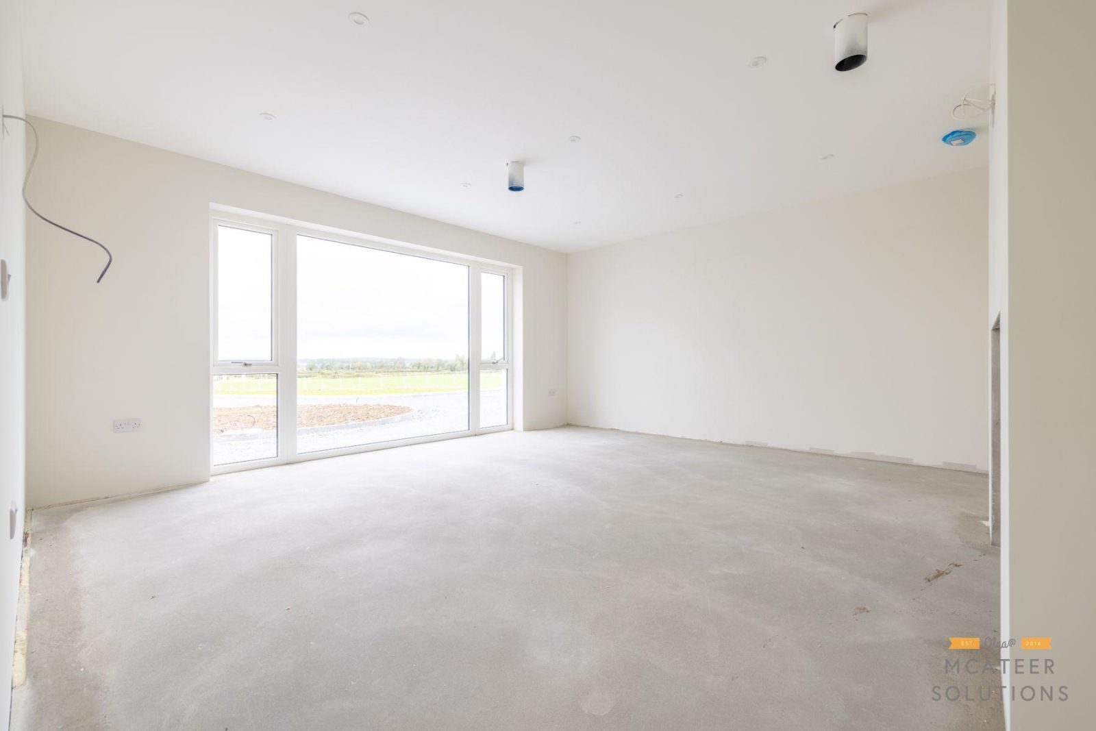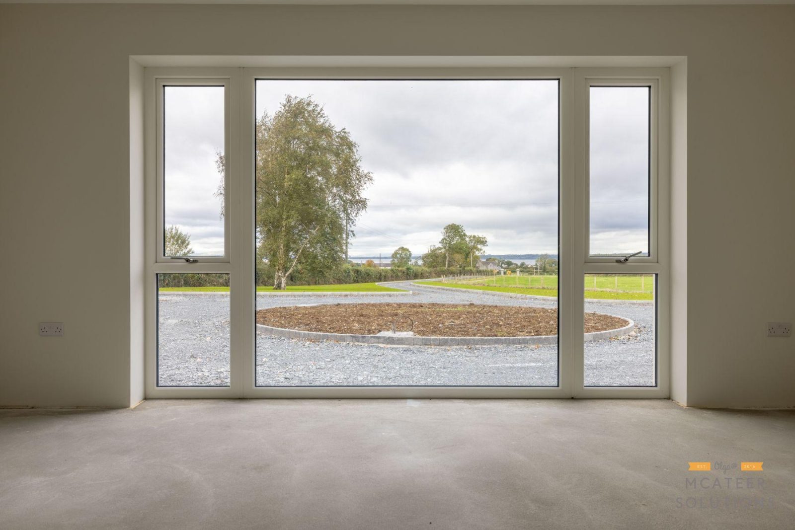 Lounge: A spacious living room with wood burning stove, large floor to ceiling window with panoramic views over Lough Neagh, buyers choice of floor finish. Measurements: 5m x 5.44m.