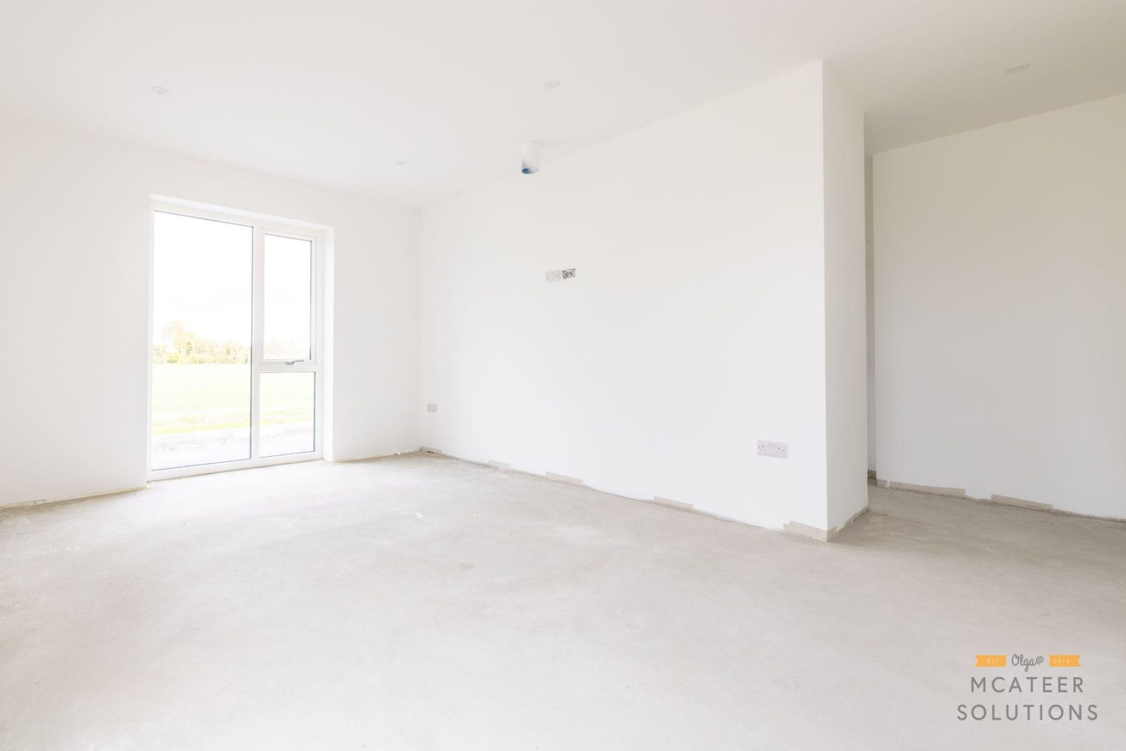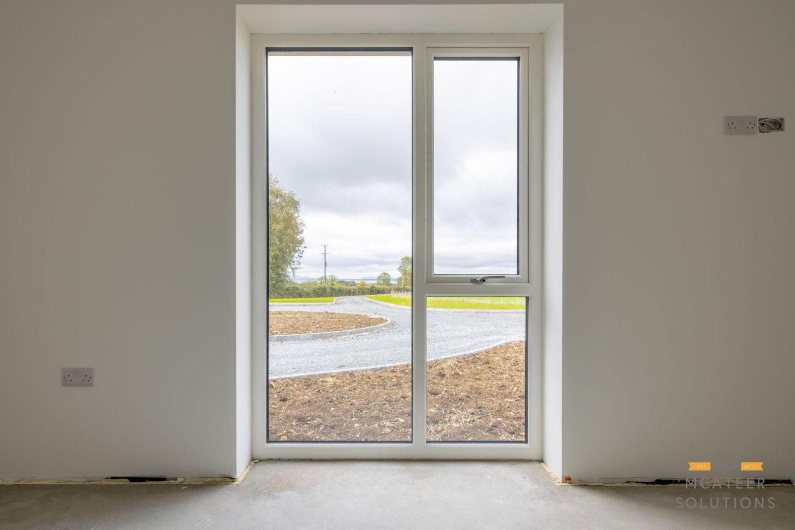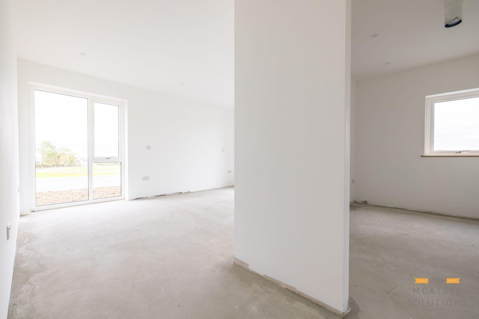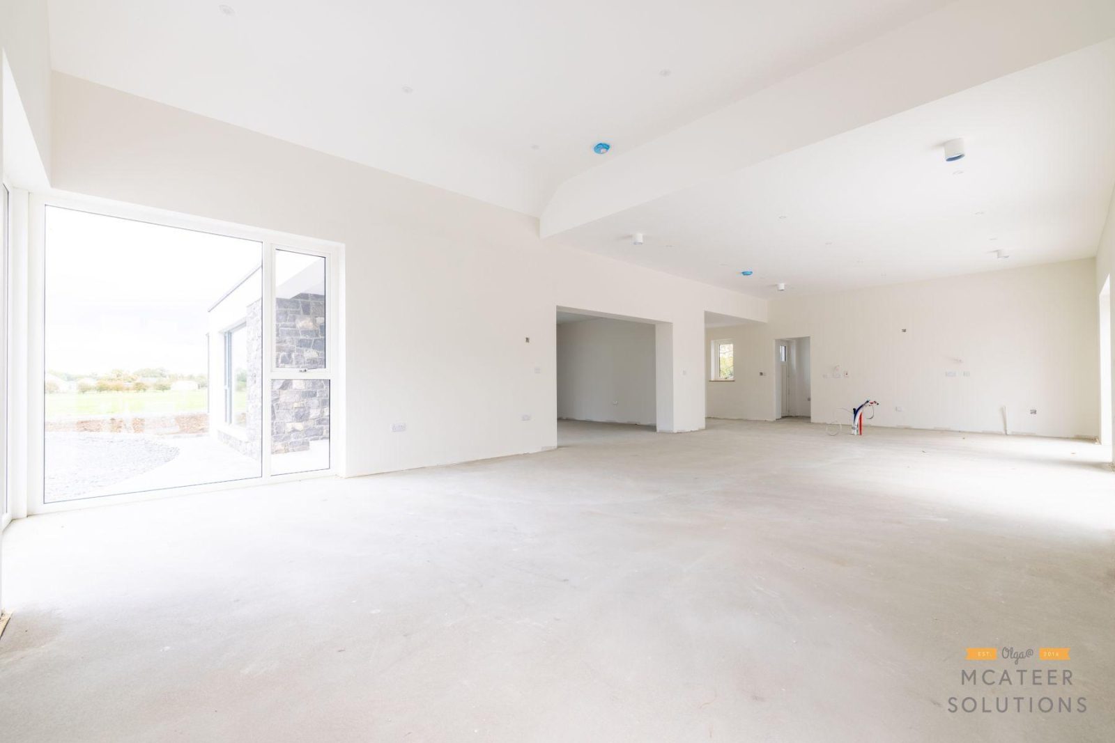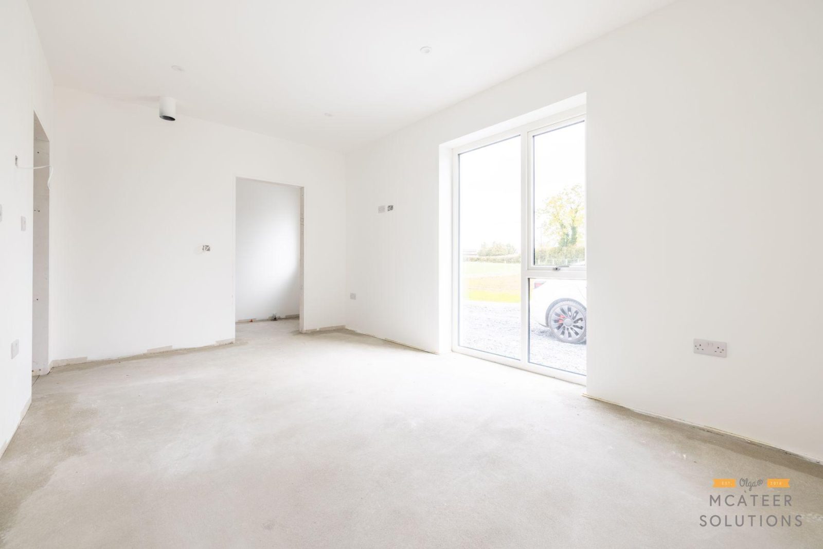 Lounge: A spacious living room with wood burning stove, large floor to ceiling window with panoramic views over Lough Neagh, buyers choice of floor finish. Measurements: 5m x 5.44m.