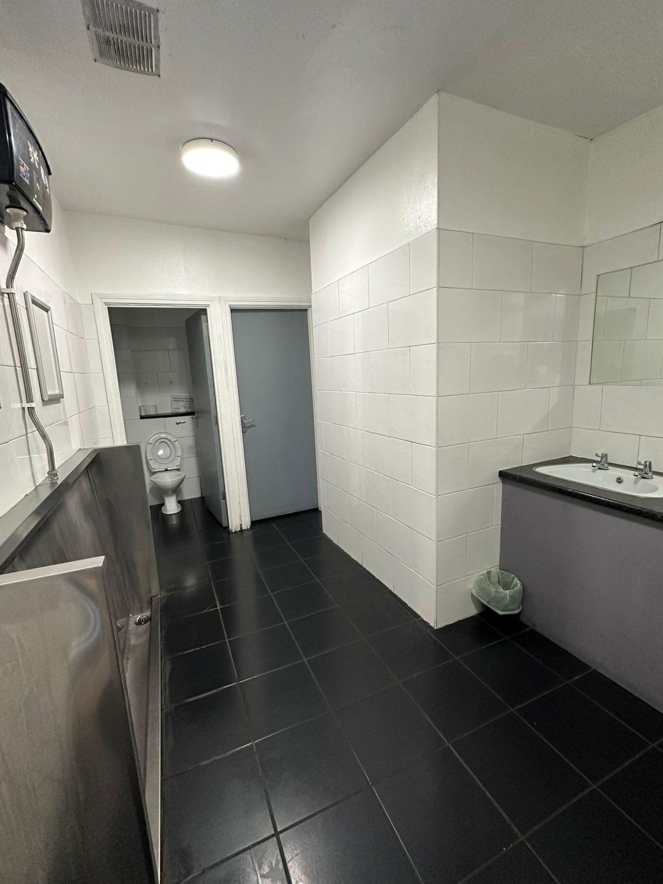 Mens W/C: Tiled Flooring, integrated vanity space with two sinks, 2 W/C areas, Urinal. Measurements: 6.04 x 2.73m