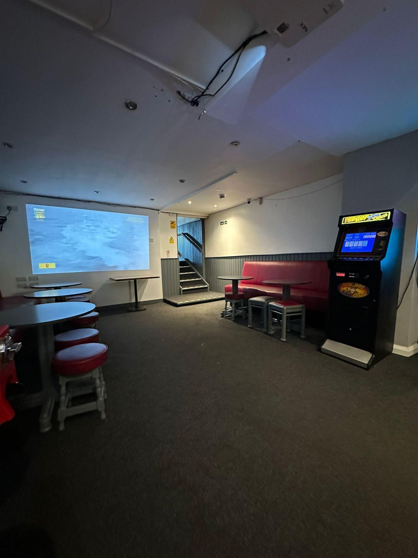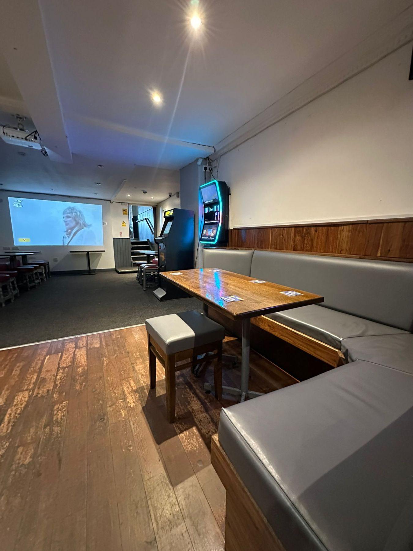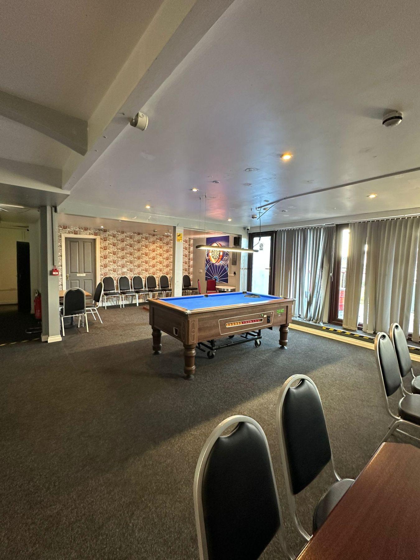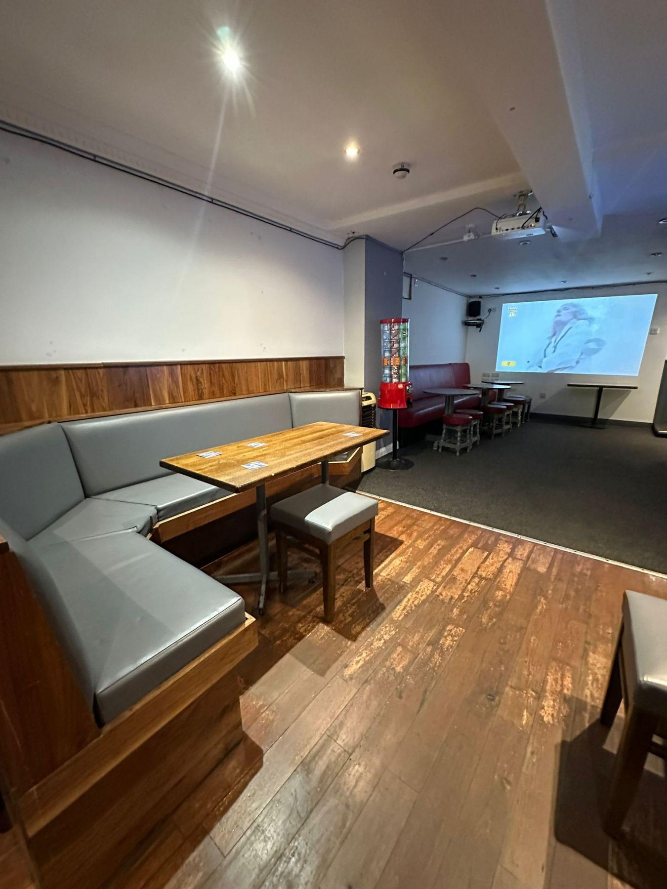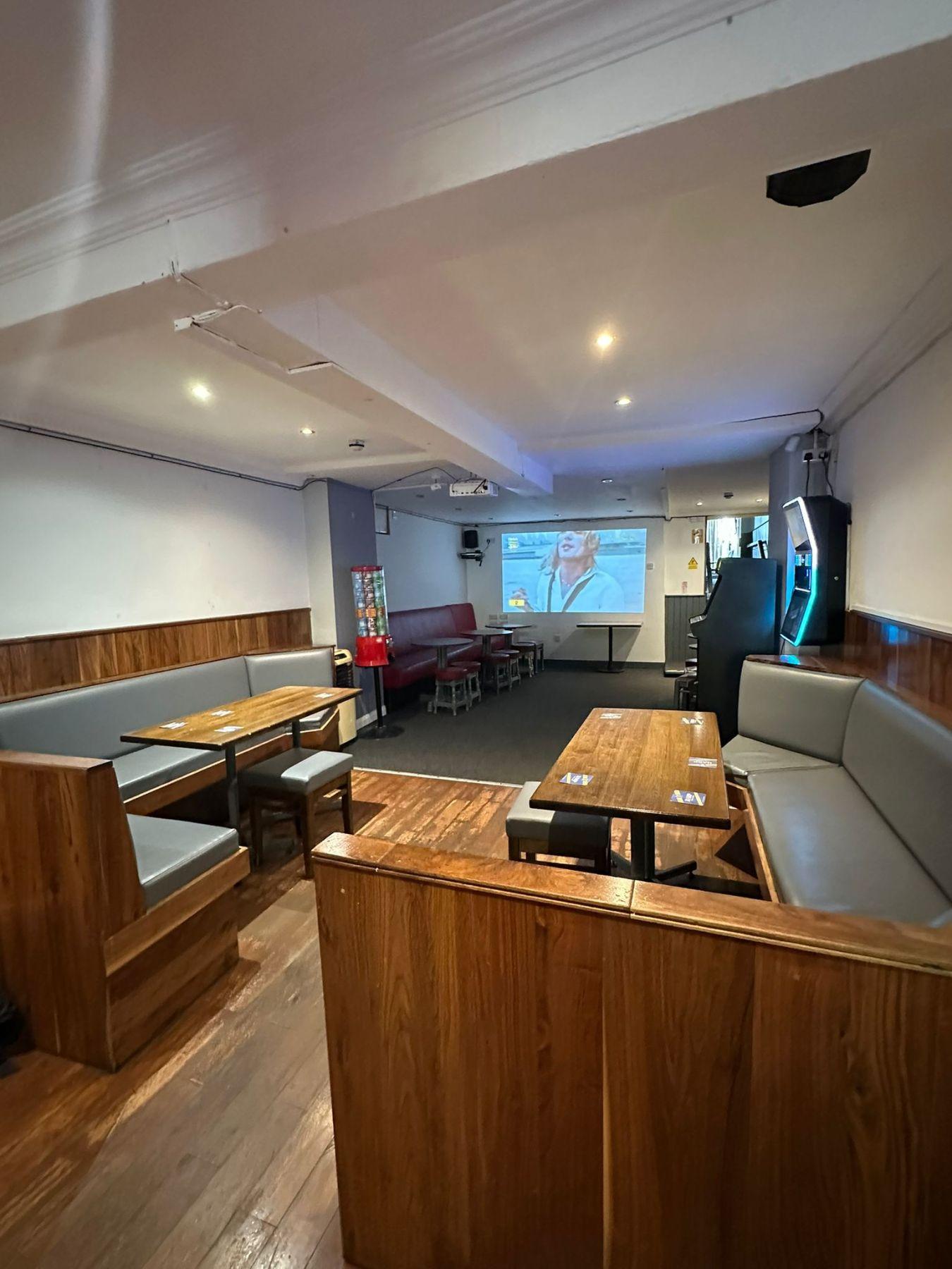 Function Room: Large function room, character black and white tiles, built in booths, stage area for live music, bar area. Measurements: 13.99m x 11.75m Bar area 4.37m x 2.72m