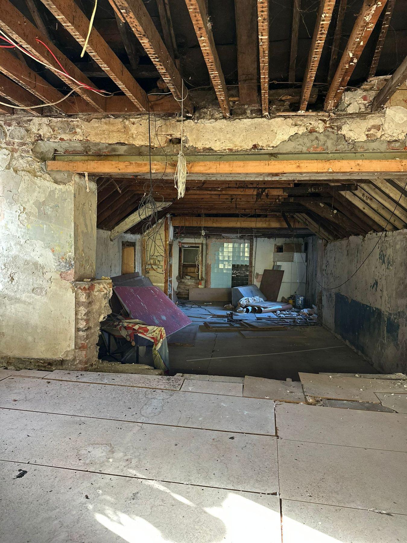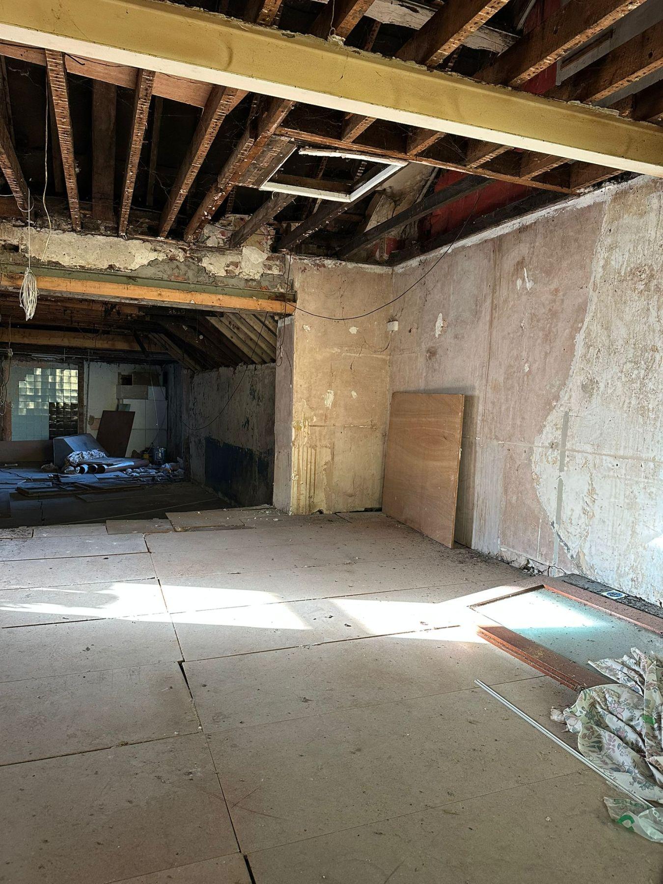 Upstairs Area: stripped back. Measurements: 16.98m x 5.52m